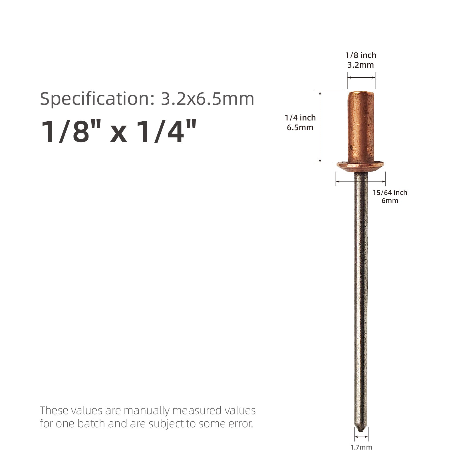 Size & Packaging - Rivet body diameter is 3.2mm/0.12"; rivet body length is 6.5mm/0.25", 9mm/0.35", 11mm/0.43".